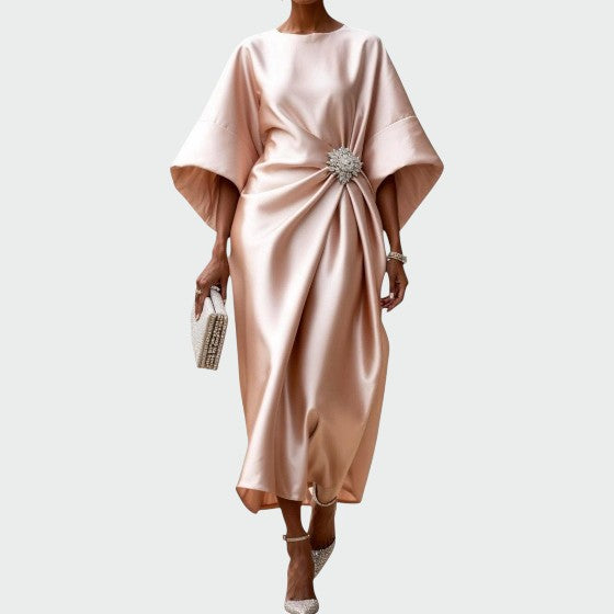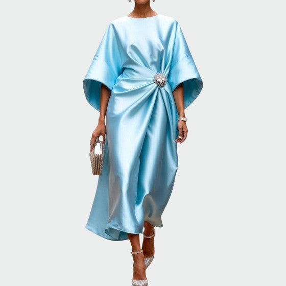 Denne smukke aftenkjole fra Alma er skabt til at imponere. Med sit flydende satinlook, sofistikerede draperinger og en elegant broche-detalje i taljen giver den et luksuriøst udtryk, der fremhæver din silhuet og tilføjer glamour til enhver begivenhed.