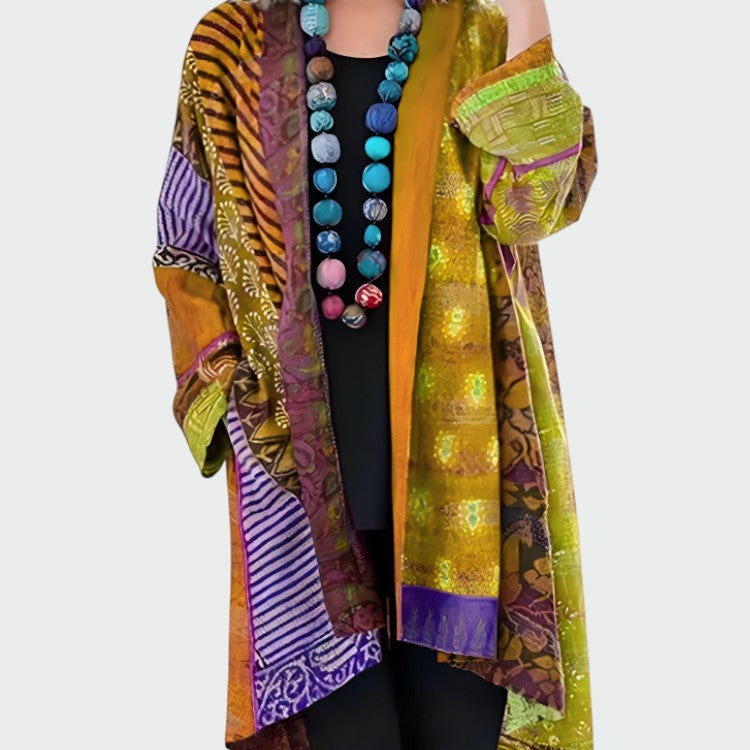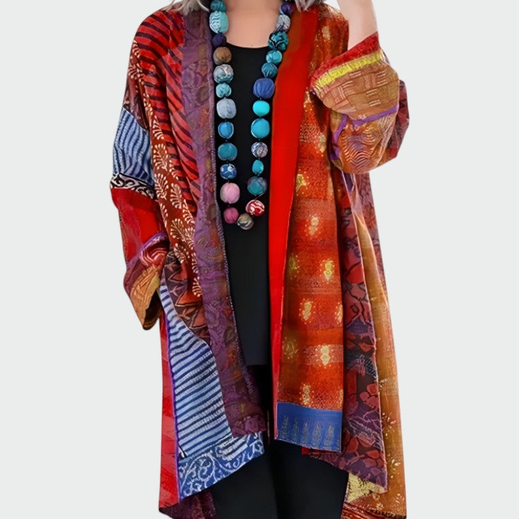 En unik cardigan, der kombinerer kunstnerisk design med komfort. De elegante lag skaber en smigrende silhuet, mens de levende farver giver et frisk og moderne udtryk. Perfekt til kvinder, der ønsker at skille sig ud med stil og lethed.